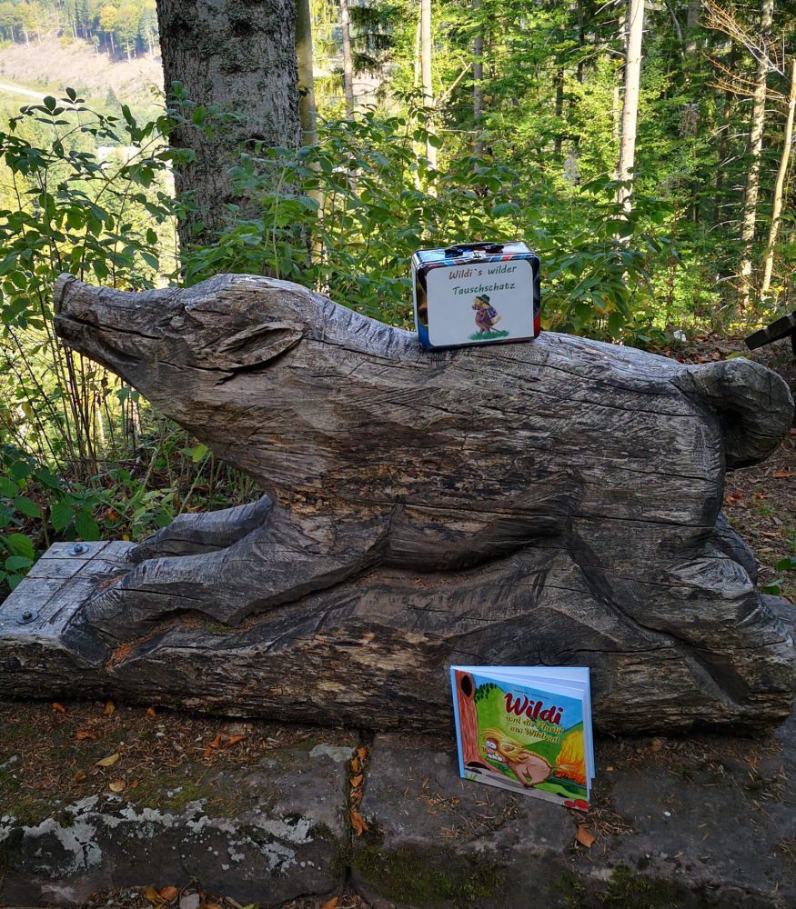 Dort durften wir mit Erlaubnis des Forstes Wildis wilden Tausch-Schatz bei der Liege und dem Holzwildschwein für Euch verstecken.